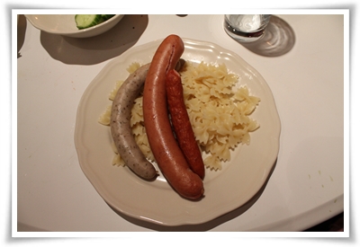 Dagens sortiment: Bratwurst, Krakowkorv och salami på en bädd av fjärilsmakaroner och snart i ett hav av ketchup.