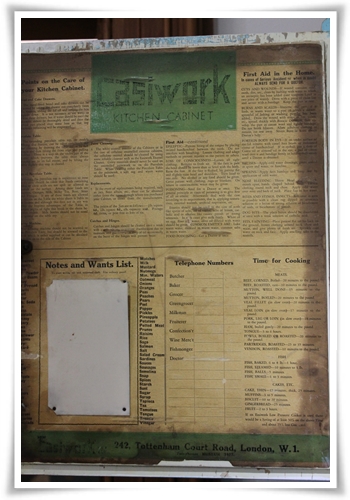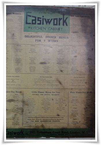 Insidan av skåpdörrarna var klädda med detaljerade instruktioner för hur man bäst skulle planera menyn, med förslag på rätter för sommardagar, rätter för vinterdagar, rätter för två personer vid speciella tillfällen och en komplett treveckors meny. Det fanns också plats för att skriva in viktiga telefonnummer, exempelvis till slaktaren, bagaren och fiskmånglaren, omvandlingstabeller för mått samt en mycket utförlig beskrivning av hur man ger första hjälpen.