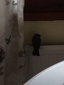 Efter att ha provat lyckan mot fönsterrutan har den slagit sig till ro högst uppe på skafferiet. Fågeln. Som flög ut ur garderoben.