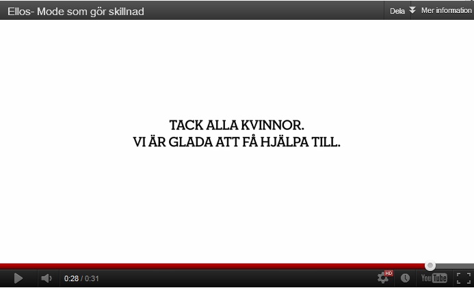 och ett hurtigt ”Mode som gör skillnad”. Men hallå! Här sumpar man världens chans att för en gångs skull göra männen till objekt och lyckas istället vända den lovande starten till en sensmoral om att kvinnors värde ligger i deras utseende. Snyggheten kvinnorna uppnår genom att klä sig i Ellos nya kollektion belönas med männens uppskattande blickar och manlig uppmärksamhet; sånt där som kvinnor nästan överallt får höra är meningen med livet. Ellos är glada över att få hjälpa till. Själv tycker jag inte att den utseendefixerade objektifieringen behöver mer hjälp.