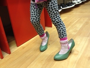 Igår, efter att vi till vår fasa insett att Tildas fötter återigen i smyg vuxit en storlek och de enda skor hon hade var ett par fake crocs, åkte vi till köpcentrumet för att åtgärda saken. Jag tänkte mig ett par vattentäta, sköna springskor. Tilda tänkte lite annorlunda.