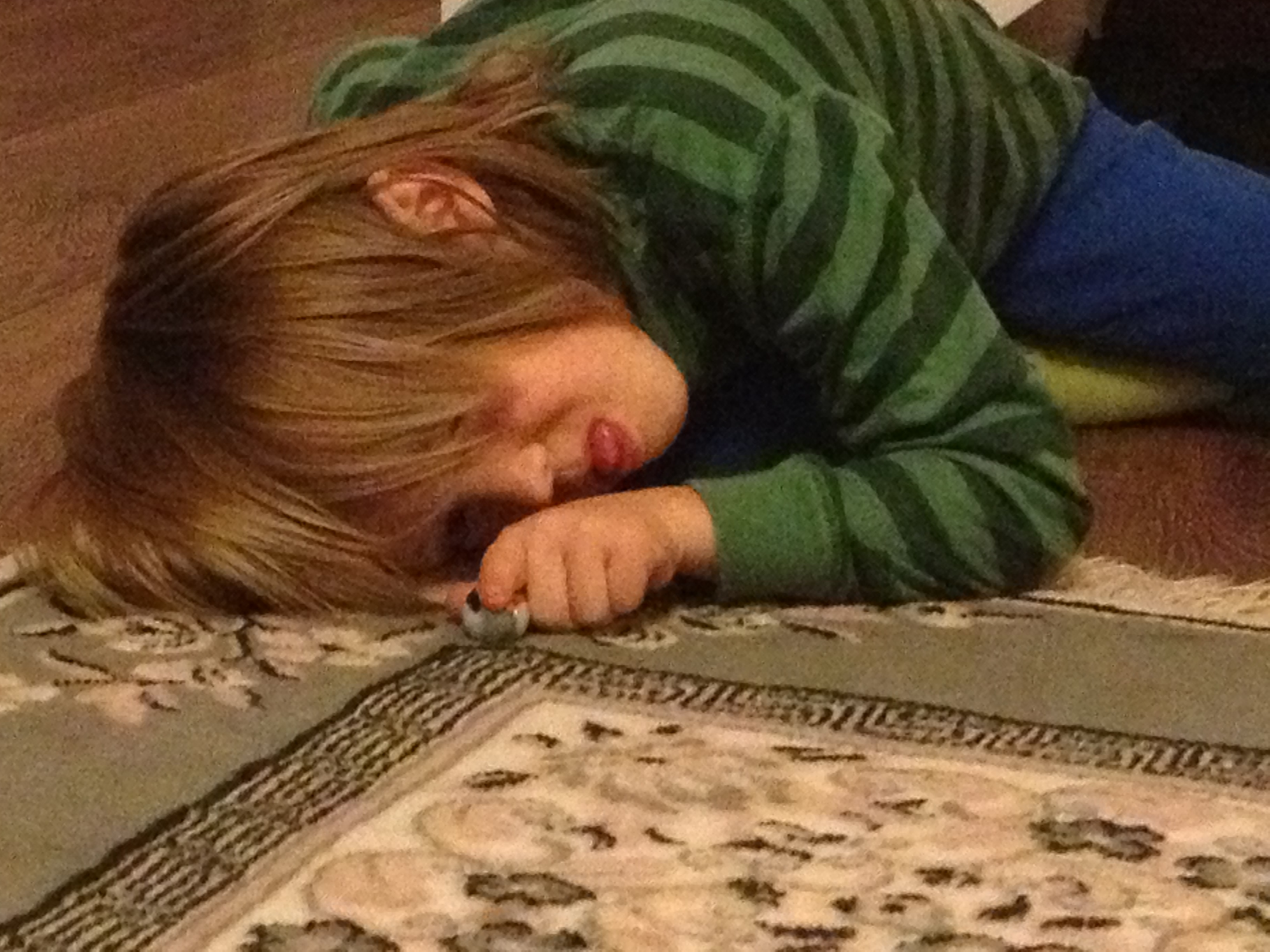 Mest för min egen skull, för att jag nu som vuxen hade råd att köpa precis vilka vackra kulor jag ville, köpte jag ett paket med 85 ljuvliga glaskulor. Barnen fick sedan välja fem var (och varje gång de spelar slut på sina kulor får de välja fem nya), jag gjorde upp en finfin bana och så fick de börja kasta. Det tog inte lång tid förrän de vunnit så pass många att jag fick göra en svårare bana och öka avstånden lite. Vi spelar på mattan för då får kulorna lagom fart. Det här är ett spel som barnen verkligen älskar! De älskar spänningen och rasslet av kulorna när de vinner en storvinst, och eftersom de får nya kulor om de råkar förlora alla är det inte hela världen. Svårighetsgraden kan varieras ad infinitum, banan ser olika ut varje gång och om de spelar bort många av sina kulor får de en roligare bana. Dessutom älskar både barnen och jag att titta på de vackra kulorna och fundera på vad de ser ut som. Där finns nattkulor, prickiga korva, spaghettis, karameller och blåbär.