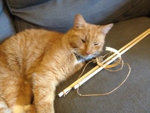 En katt och en eller två pinnar med snören som en gång i tiden hade fjädrar. Många långa timmars vild underhållning.