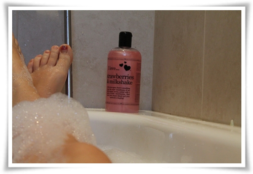 Sedan lade jag mig i ett varmt bad och plaskade runt i bubblor som doftar precis så man tänker sig att en bubbelprodukt som heter I love strawberries & milkshake borde dofta.