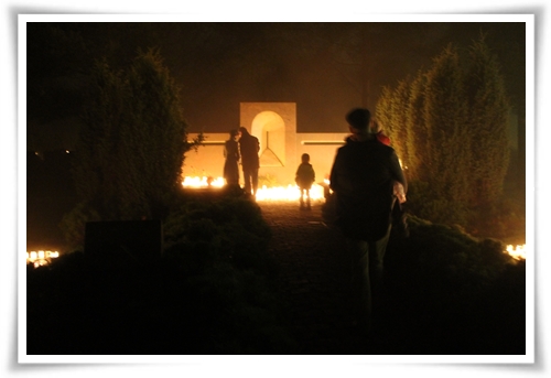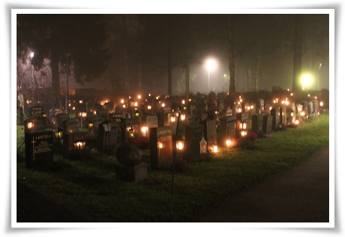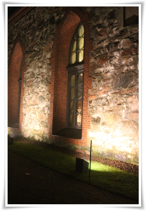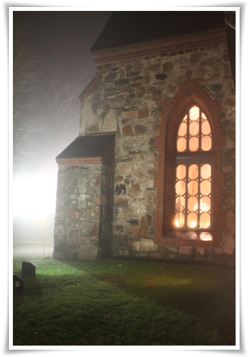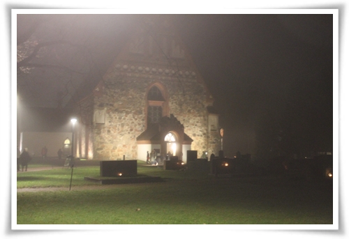 Dagen efter, på Alla helgons dag, åker vi alltid till kyrkogården och tänder ljus. Ofta blir det en hel del diskussioner om det här med döden då. I år pratade jag och Tilda om hur min mormor dog. Jag försökte förklara att hon var väldigt, väldigt gammal och att hennes hjärta därför inte orkade mer. Tilda insisterade på att min mormor nog inte åt ordentligt och att det var därför hon dog. Förra året fick Vilho för sig att min mormor var begravd under vårt förråd och inga förklaringar i världen hjälpte, så på många vis var Tildas syn på vikten av bra kost ett steg upp på verklighetskopplings-skalan. Vår närmaste kyrkogård är Helsinge St. Lars. Eller. Rent geografiskt är det väl kanske inte den närmaste kyrkogården, men det är den närmaste kyrkogården med en medeltida kyrka och det är förstås vad som räknas. I lördagens mjuka dimma och upplyst av tusentals tända ljus var kyrkan helt magisk. I över 600 år har folk kommit för att söka trygghet och tröst vid de här murarna, och nu står vår lilla osannolika familj här och tänder ljus för dem som är långt borta. Det var nästan lite mer än mitt sköra historikersinne klarade av att hantera. Lycklig blev jag också när mina små barn ville gå in och titta inne i kyrkan (det är sällan man ser kyrkor som är så vansinnigt snyggt renoverade på insidan, så det kan varmt rekommenderas). Tilda tittade runt omkring sig och konstaterade att just en sån här ville hon ha!