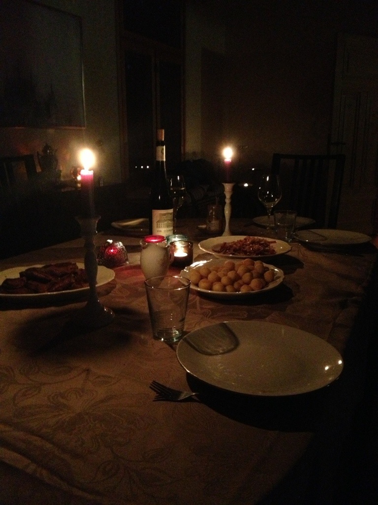Men sånt där gör liksom inget när vi sitter vid bordet i salen, med tända ljus och äter god mat.