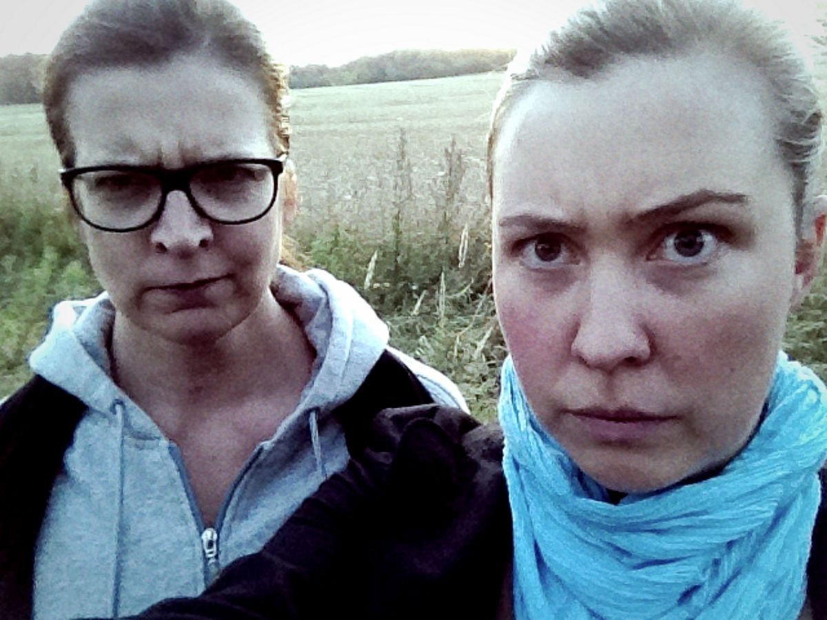 Kan nu meddela att det bästa sättet att tillgodogöra sig rapporter från Nickby är in person. Jag och Micaela gick en hurtig motionsrunda på något av rekord(långsam) tid, dels för att det är svårt att gå fort när man pratar mycket och dels för att jag varit sjuk i tre dagar och fortfarande inte var helt på topp. Tog en solnedsgångselfie där vi ser riktigt arga ut för att kompensera att kvinnor alltid ska se så glada ut på bild.