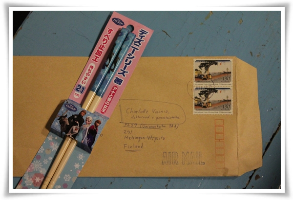 Jag läste på din blogg om missödet med din dotters julkalender. Det verkade inte som att jag riktigt kunde släppa det, för när jag sprang på de här ätpinnarna med Frozen-tema här i Tokyo kom jag att tänka på Tilda och hur du har skrivit att hon älskar, inte bara Frozen, utan även sushi. Jag kunde därför inte låta bli, impulsiv som jag är, att skicka dem som en liten julklapp till Tilda (även om det inte är säkert att det kommer fram innan jul.) Hoppas det är ok för dig och att hon blir glad.