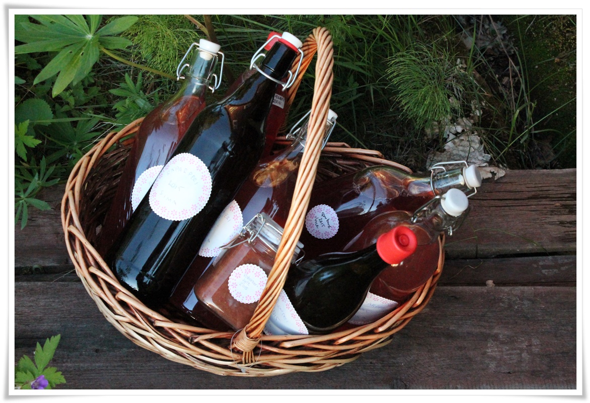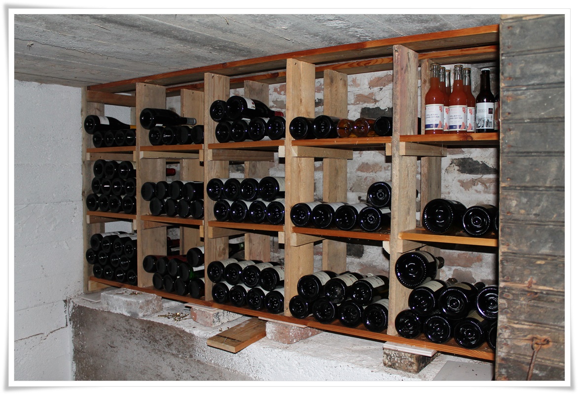 Rabarbern som täcker nästan hela baksidan av trädgården har blivit många liter saft och sylt. Min högt vördade make har slitit med att omvandla den mindre av jordkällarna (jo, det finns två) till ett ställe för förvaring av sylt, saft och framför allt vin, snarare än långsamt möglande skräp. Med vitkalkade väggar och hyllor snickrade av bråte kommer man väldigt långt.