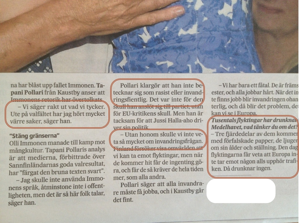 sannfinJournalisten (namnet har jag valt att dölja) har intervjuat sannfinländaren Tapani Pollari som sedan fritt får flera, förvisso korta, spalter att propagera för sin syn på partiet och världen. Pollari menar att han inte är varken rasist eller invandringsfientlig. Han hävdar också att Immonens upprop om kamp mot fienden mångkultur är så som folk pratar och att han är glad över att Jussi Halla-Aho, Immonen och de andra är med i partiet eftersom de ger information om invandringen som annars inte skulle komma fram. Han avslutar med att säga att de tusentals som drunknar på Medelhavet i princip får skylla sig själva eftersom tre fjärdedelar av dem är lögnare med förfalskade papper.