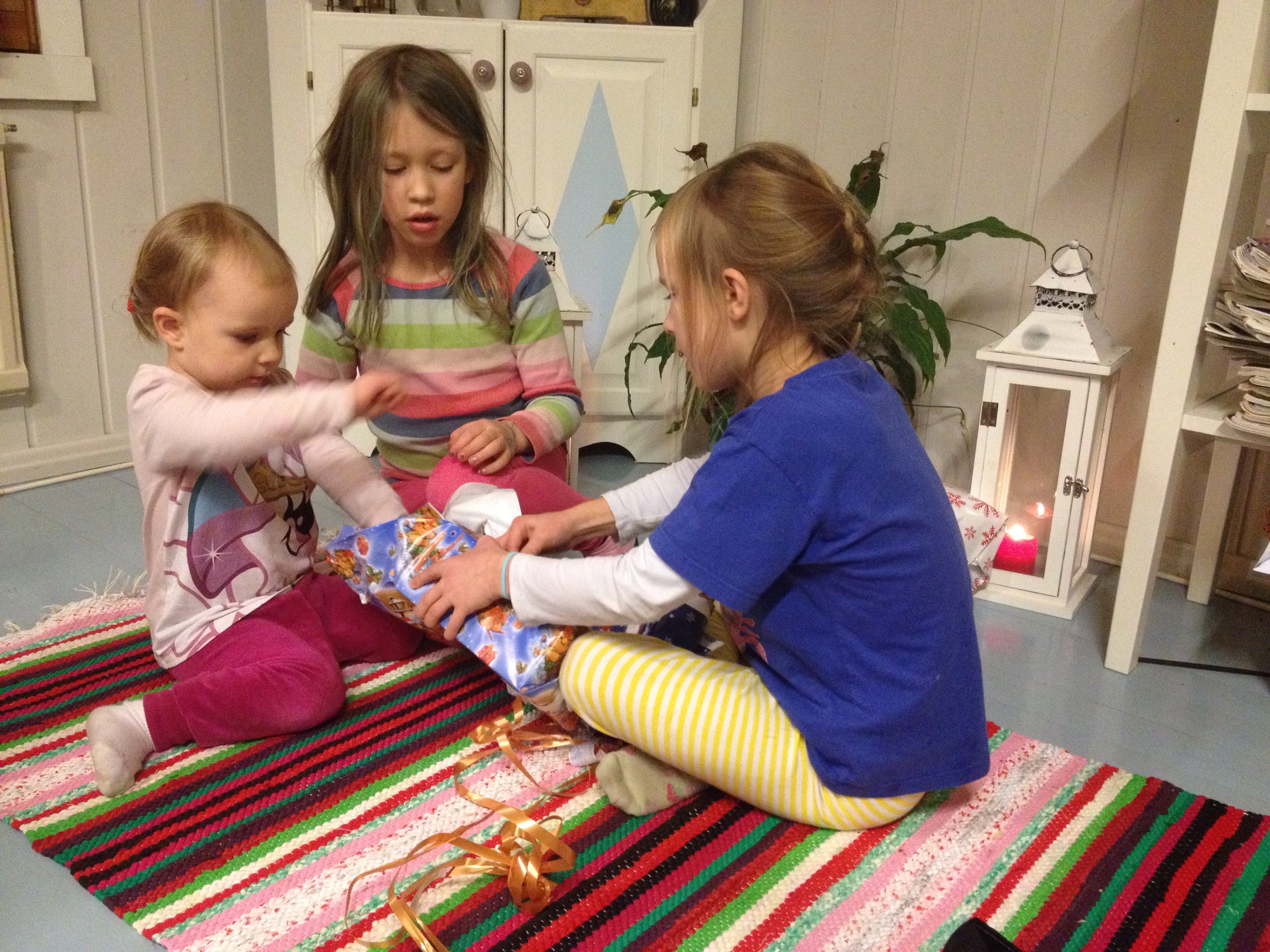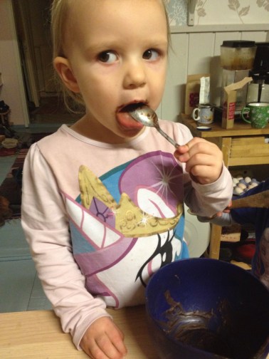 I dag har jag och Tant Annika haft den traditionella stora bakardagen, även om vi i ärlighetens namn bara hann med tjong (gräddkarameller), fudge och saffransskorpor för att vi båda två var trötta som as. Barnen hjälpte till, men det var mest i skedet när det var dags att provsmaka eller diska bunkar. Vi hade också lite julklappsöppning och middag i salen. Så där som det ska vara. Snön låter vänta på sig, så man får skapa julstämning med det man har liksom.