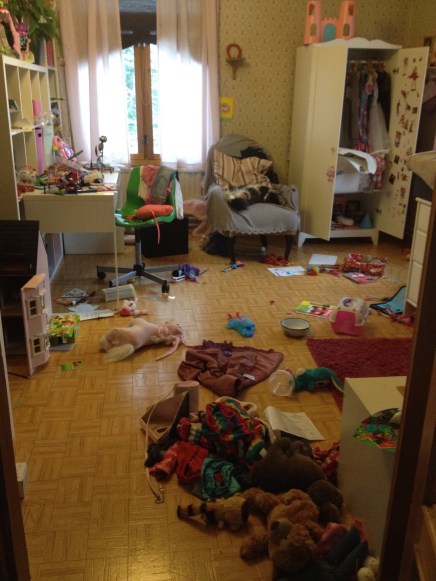En sak jag var lite orolig över är att mina barn skulle växa upp i tron om att någon annan plockar undan deras skit. Så har det dock inte blivit. Inte ens lite. Tvärtom snarast. Nedan finns en bild på dotterns rum i skrivande stund. För att städerskan ska kunna göra sitt jobb (vilket inte sträcker sig bortom att dammsuga och tvätta golv) måste barnen städa. Av respekt för andra människor, måste barnen plocka undan efter sig. De förstår konceptet betydligt bättre än vad de rent krasst är bra på att hålla ordning, ska väl tilläggas, men det funkar ändå. Det att kvällen innan städerskan kommer måste allt ha röjts undan.