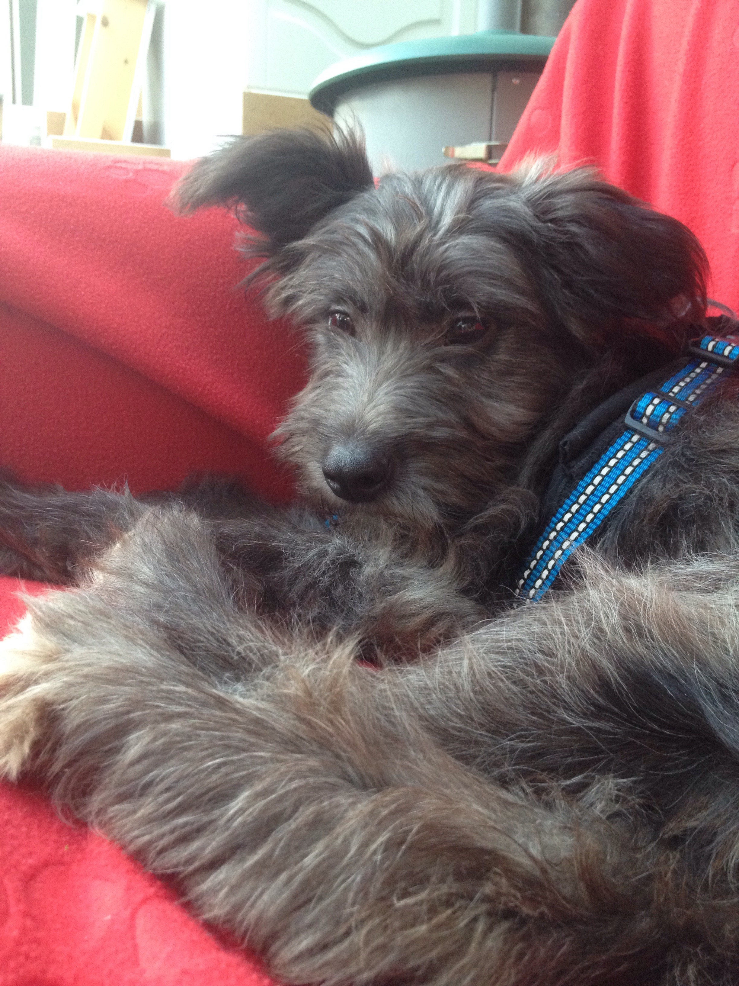 Jag är ledsen att det tog så lång tid innan jag delgav er den fina nyheten att vår hundvalp har kommit hem men jag har banne mig inte sovit på tre dygn. Hon är betydligt större än jag trott, med de fluffigaste tassarna jag sett och ett prima skägg. Jag visste att hon inte skulle vara rumsren, men hon är antirumsren – ser hon ett rent rum måste hon kissa där. På plussidan har jag ju nu fått tummen ur och tvättat alla mattor.