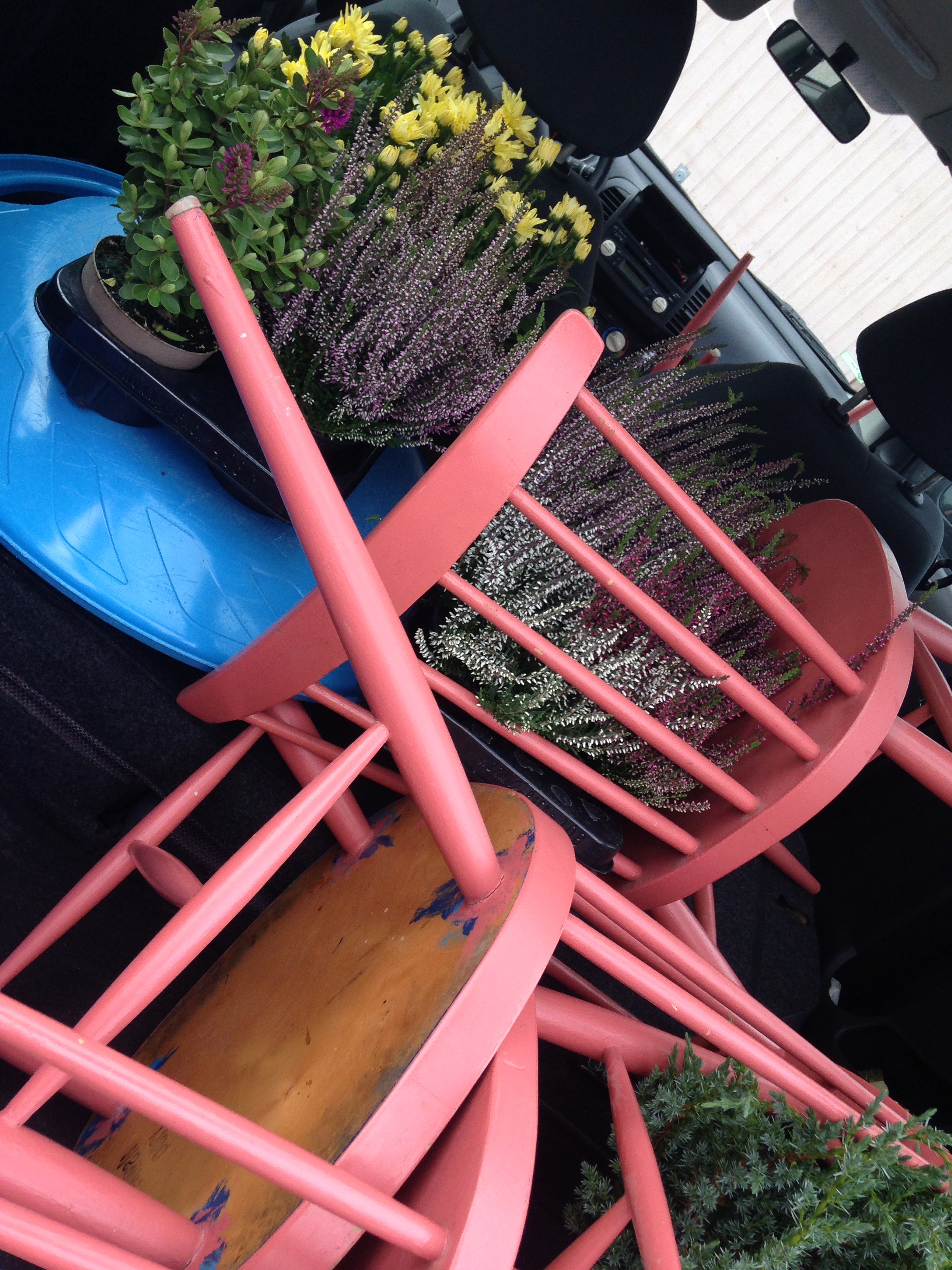 Vi håller på att på riktigt flytta in i det huset vi har bott i det senaste halvåret. Liksom göra det till lite mer vårt eget. Så jag köpte stolar som jag åkte och hämtade och som var billiga tills det visade sig att Den Stora Blomaffären låg precis i närheten och priset steg exponentiellt. Fyra stolar gånger priset på rabatterad ljung upphöjt i kvadrat. Och solgul krysantemum.