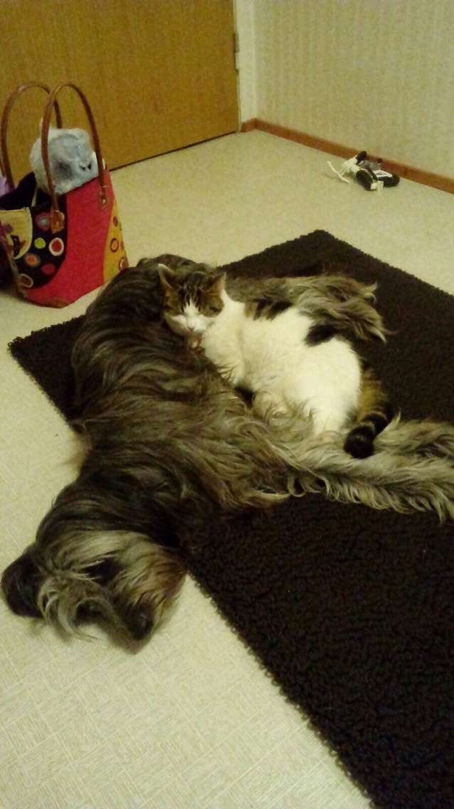 Jag får ofta frågor hur katten och hunden kommer överens. Så här såg det ut på Tildas golv när vi läste kvällssaga.
