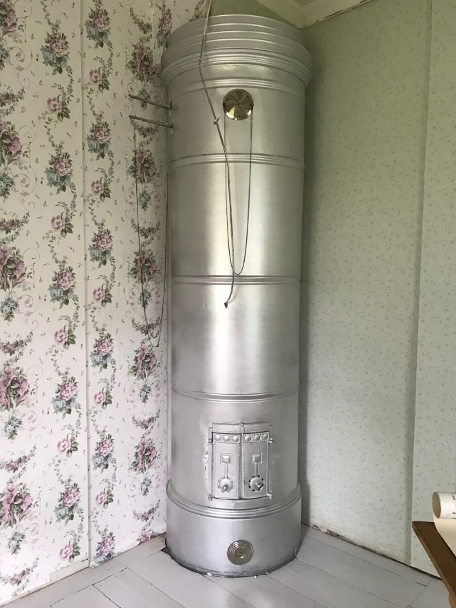 Barnen har helt fritt fått välja tapeter till sina rum. Tilda valde en snirklig blommig som gjorde en enorm skillnad i rummet, trots att hennes var det med de fräschaste tapeterna redan innan. Det gråa golvet har jag valt och det går igenom hela huset (sedan när det är färdigt…). Här har jag tapetserat fram till kakelugnen. Sådana här ugnar finns för övrigt i alla rum.