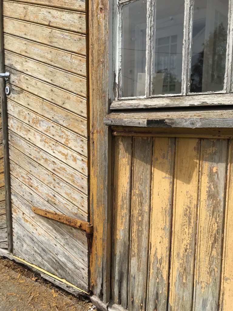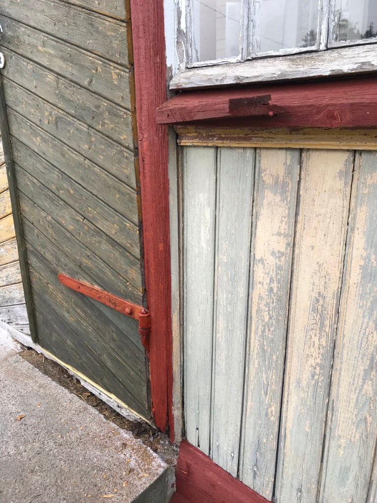 På den här bilden ser man de olika färgerna på det parti som är precis under gångjärnet på dörren och de två brädor som är närmast dörren på fasaden.
