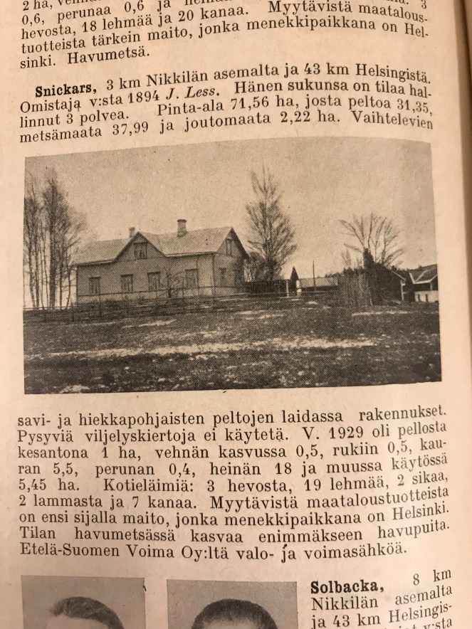Fyra våningar ner i källaren under universitetets bibliotek hittade jag en bok om Finlands bondgårdar från 1929. Och där, där fanns min gård listad. Ägare var då J. Less (han som poserade på bilden med sin fru) och han hade ägt den sedan 1894. Vid det laget hade gården varit i hans släkts ägo i tre generationer. Arealen var 71,56 ha och det fanns tre hästar, 19 kor, två grisar och lika många lamm, samt sju hönor. Bilden på huset kan alltså vara som nyast från 1929, och det är framförallt två saker som förändrats: färgen (mer om det senare) och fönstren på baksidan. Numer är de två fönstren på mitten sammanslagna till ett stort fönster. Att någonting med baksidans exteriör hade förändrats visste jag sedan tidigare, för om man tittar riktigt nog så ser man att en del av panelen är för rak nu. Ja, och man behöver inte titta noga alls för att se att det är något med proportionerna på baksidan som bryter harmonin på ett sätt som ett så här gammalt hus inte skulle vara befläckat med om det inte byggts om.