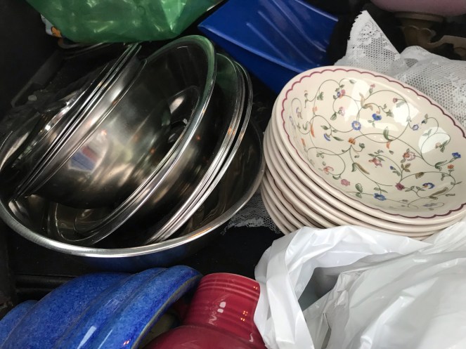 Och på loppis hittade jag 20 metallskålar och -fat för 5 e, samt nio alldeles perfekta engelska porslinstallrikar med snirkliga blommor till det facila priset av 3,50 för hela traven. I de skålarna åt vi kycklingsoppa till kvällsmat.