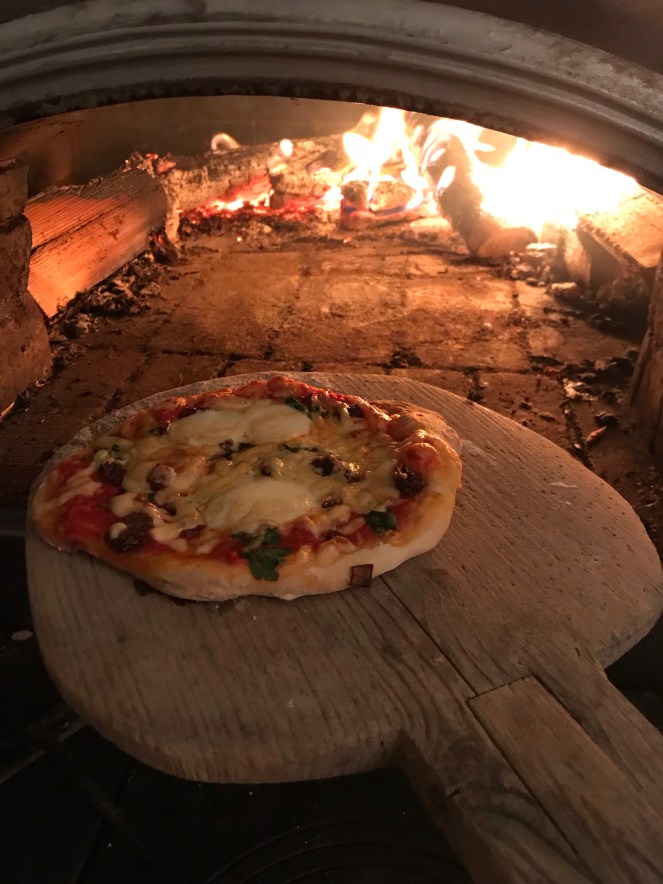Om någon tycker att det blev för mycket sliskig lycka nu så kan jag berätta att det var sjukt svårt att få pizzorna in i ugnen. Den första lyckades jag flippa så fyllningen kom nedåt. Lite senare, när jag trodde att jag lärt mig, puffade jag till pizzan med sån snärt att jag sköt mozzarellabollarna på den rakt in i elden. Det kräver nog lite mer träning…