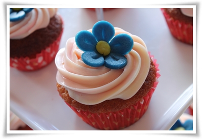 Vanliga vaniljcupcakes med vitchokladfrosting, och en blåsippa i marsipan.