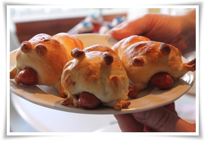 Min högt vördade, älskade make bakade korvmonster – en enkel bröddeg snurrad runt korv och dekorerad med ögon och små tassar. Förvånansvärt gott!