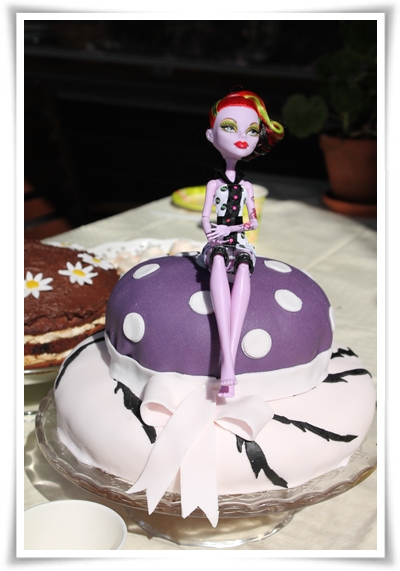 Monster High-tårta med docka på (och den skulle sitta ovanpå, just så här, enligt beställaren). Den lila marsipanen var otroligt snygg och dugligt god, men fruktansvärt svårarbetad. Det ljusrosa är sockermassa. Tårtan är fylld med vaniljkräm (recept kommer senare!), jordgubbar och extra mycket grädde. Så Operetta ska kunna sitta mjukt där uppe. Det är inte så lätt med så benig rumpa.