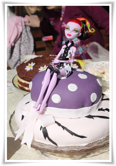 I går var vi äntligen friska nog att kunna fira Tildas kalas. Tilda hade bjudit några vänner från dagis först, och därefter bjöd vi alla föräldrar på kaffe och tårta, och sedan kom släktingar, grannar och andra sorters vänner (alltså sådana som för ett tag sedan passerat 5-åringstadiet – åtminstone på en biologisk skala). Tilda var väldigt noga med vad för sorts tårta det skulle vara, och ännu mer noga med att vi minsann inte talar tårta i singular när det gäller hennes kalas. Nej, det skulle vara en chokladtårta som inte skulle vara täckt och som skulle ha vitt längs kanten, en Monster High tårta som skulle vara randig som en tiger, prickig, väldigt stor och ha en docka på. Sedan skulle det också finnas cupcakes ”och sånt”.