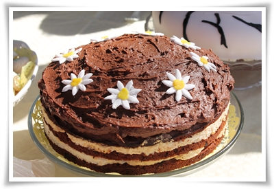 Chokladtårta fylld med kolagrädde (smält toffeechoklad blandad med färskost och vispad grädde) och toppad med chokladsmörkräm (smör, smält mörk choklad, kakao, florsocker, några droppar kaffe och lite varmt vatten). Tilda har faktiskt alldeles själv gjort blommorna på!