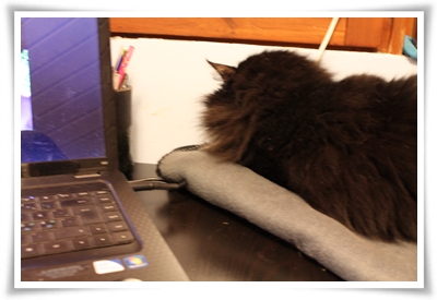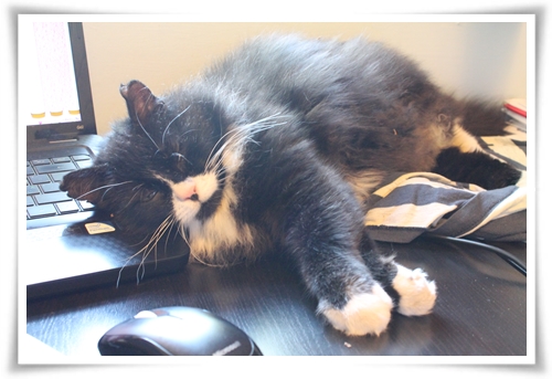 Ligger på en filt på skrivbordet. Faller handlöst med alla klor frenetiskt vevande och pälsen uppbullad som en automatisk airbag – från filten en knapp centimeter ner på skrivbordet.