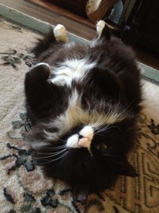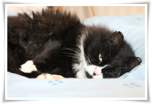 För snart 9 år sedan åkte jag och min högt vördade make (då nye pojkvän) till Lahtis katthus för att adoptera en hemlös katt. Jag kom dit med två kriterier; Att 1) det skulle vara en flicka och 2) den fick ha vilken färg som helst utom svartvit. Vi tittade på säkert 100 katter men hittade ingen som kändes helt rätt. Från ett stängt rum, som visade sig vara karantänrummet hörde vi dystra mjauanden. I en bur, tätt tryckt mot gallret för att få njuta lite av det solsken som strilade in genom fönstret, satt den sorgligaste katt jag någonsin sett. Rakad överallt utom på tassarna, svansen och huvudet. Benig, ensam och trött. De hade just hittat katten i skogen. Pälsen var så tovig att de fick raka bort den. Magen så full av maskar att han kräktes upp dem. Stora sår över bringan och trasade öron. Och så fick jag honom i min famn, han puffade min näsa med sin blöta nos och spann så vi båda skakade. Det var inget svårt val, även om jag fortfarande inte säker på om det var jag som valde honom eller han som valde mig.
