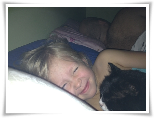 För Katt är inte direkt vänskaplig mot andra katter. Han var kung i vårt förra kvarter och är kung här ute på landet nu. Det finns inte en uppkomling han är rädd för att spöa. Inte ens några kompisar pitbullterrier, som råkade ut för Katts vrede. Vi fick låsa in Katt medan hunden var på besök. Och vi hade klippkort hos veterinären för vi var där mest hela tiden. Katt lämnade prydliga tofsar av andra katter i trädgården och kom in med blodet droppande från öron och nos. Men kattungarna rörde han aldrig mer än de förtjänade. Att säga att han tyckte om dem i början var väl lite överdrivet, för första gången han mötte dem stod han blickstilla – som om han var fångad i en ond dröm som skulle sluta om han bara kunde vakna. Barnen var förtjusta förstås. ”Titta mamma, han vet att han är deras pappa!” Med tiden lärde han sig att inte bara tolerera dem, utan även söka deras sällskap. Särskilt under den där mörka senvintern när människotår var hård valuta. ”Kattrallyt går!” skrek barnen glatt och så hejade vi på katterna när de for runt som vildar längs golv, väggar och vad som en gång varit vackra gardiner.