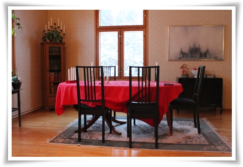 Så här ser det ut i salen, med julduken på bordet. Hittar ni katten?
