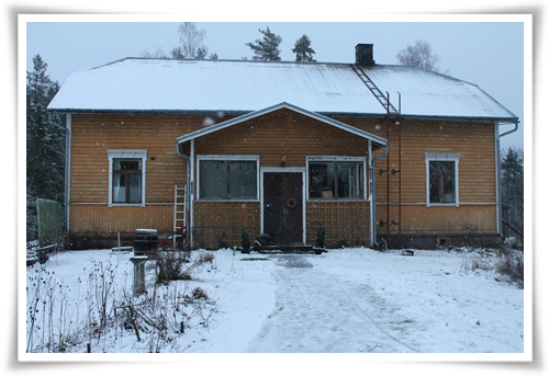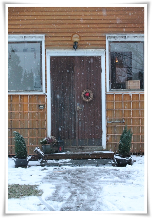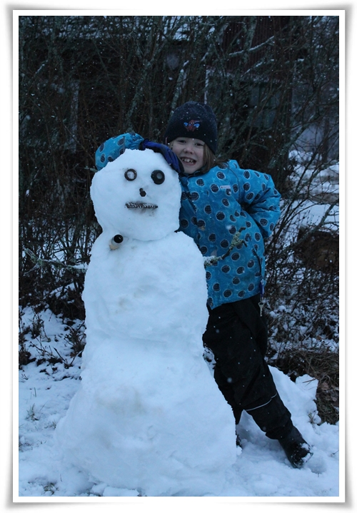 I dag har det snöat, så ändå i… Mest har det varit blöt snö dock, så det är inte så mycket kvar. Vi har julpysslat lite, gjort en krans till lillstugans dörr så att det inte ska se så övergivet ut, byggt snögubbe, bakat julbröd, tränat på julsånger och sånt. I morgon är Stora Bakardagen, när vi bakar julgodis tillsammans med familjen B. Hoppas att strömtillgången är mer jämn då än vad den varit i dag. I dag har elen blippat som om en liten treåring stod och fipplade med en gigantisk strömbrytare.