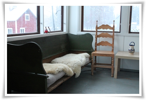 Nästa steg blir att måla fönsterkarmarna vita och få dit ett vackert spröjs. men redan nu är verandan ett av mina absoluta favoritställen. Dels förstås för att mina fröodlingar växer så det fullkomligt knakar där ute, och dels för att den, åtminstone för mig, visar hur lite det egentligen behövs för att göra skillnad i ett gammalt, trött hus. Färgen fick vi begagnat, mattorna för typ 5 euro på loppis, tulpanvasen tror jag kostade 4 euro på samma loppis, soffan är hittad på vinden och fylld med soffdynor från en soffa som fick flytta till soffhimlen. Det jag betalat mest för på bilden är högst troligen den sovande katten, Noppa. Värd varenda cent, förövrigt!