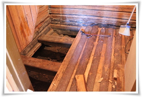 Sedan släpade vi ner en gammal träsoffa som vi hittade på vinden. Bordet på bilden här ovanför står för tillfället i köket som det där bordet man lägger ifrån sig alla grejer på. Ett riktigt prima gammalt bord som stod på verandan, täckt med en allt annat än ny vaxduk, när vi kom hit.