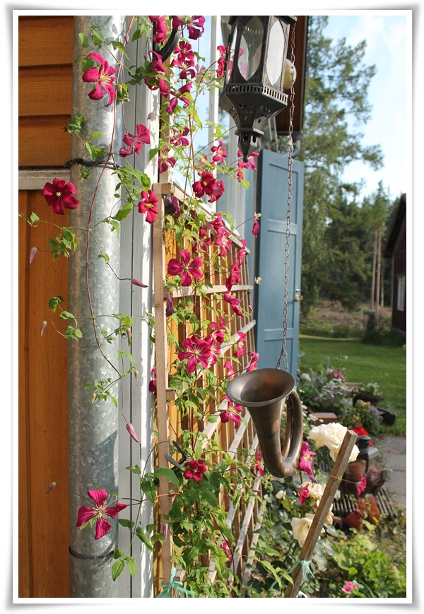 Den humle som tidigare växte upp för att täcka verandan som ett solskydd grävde jag glatt upp förra året. Nu blommar klematisen och de fantastiska rosorna i rabatten i stället. Det där förvisso ett tag innan de vuxit sig stora nog att klättra upp runt fönstren, men jag har på känn att det kommer att vara värt väntan. Mathornet hänger på sin krok. Det blåser vi i så det ekar över åkrarna när barnen ska komma hem och äta. Det har visat sig synnerligen effektivt på långt fler än våra barn.