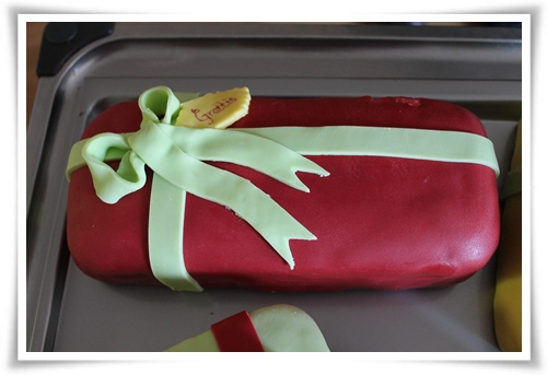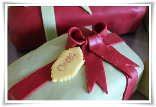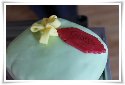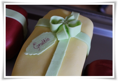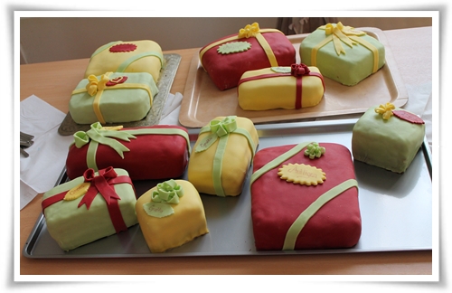Och så var det tårtor förstås. Önskemålet var många färger och inga rosor, krusiduller och flufferier. Så det blev ett paketbord med tårtor. De röda var fyllda med vit choklad mousse och bottnarna gjorda av hallon och mörk choklad. De gröna var fyllda med en apelsinkräm och chokladganache. De gula var fyllda med hallonsylt och vaniljkräm.