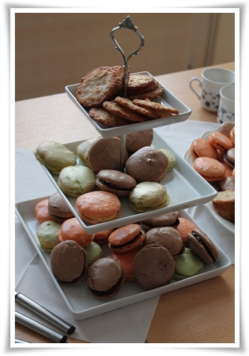 Av överblivna äggvitor gjorde jag några macarons. Hälften försvann på den tiden det tog mig att fotografera tårtorna.