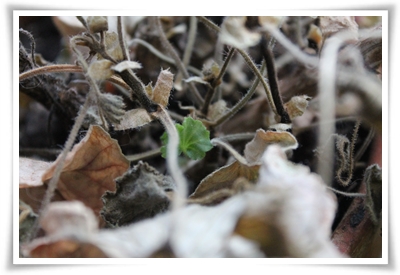 Och den stackars pelargon som i brist på ljus har vissnat mer och mer för varje mörk vårdag har fått stå kvar vid fönstret på mitt bord, som ett sorgligt skelettvittne över den förlorade solen. Men så, när jag tittade lite närmare: LIV!