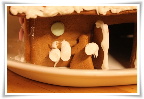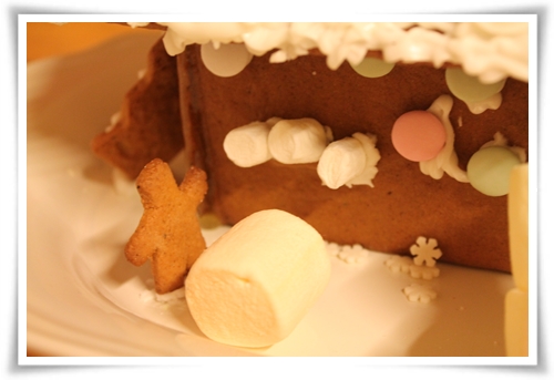 Och här håller pepparkaks-Vilho på att rulla sig en snögubbe av marshmallows.