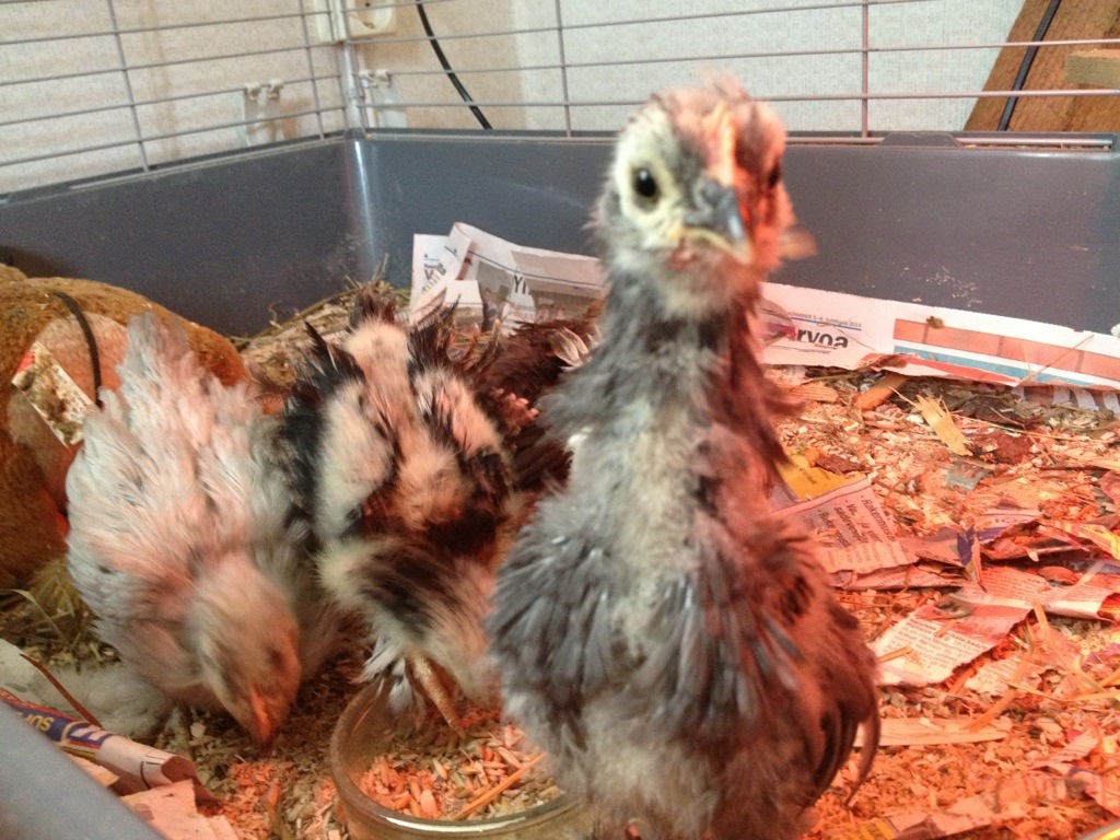 I dag fick så slutligen kycklingarna flytta ut tillsammans med kaninerna på lillstugan (de har förstås skilda burar, men bor i samma rum). För de är inte direkt några ulliga gulliga kycklingar längre. De har definitivt nått stadiet då de snarast ser ut som heroinmissbrukande kråkor. Men jag gillar det på något vis. De är så nyfikna på allt, och sträcker på sina små halsar samtidigt som de piper förnärmat.