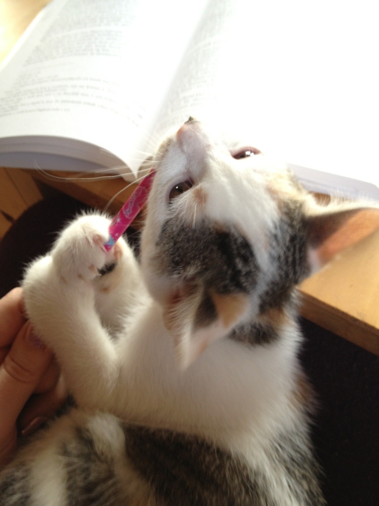 Och nu försöker Rasputin äta upp min penna som straff för att han inte får ligga i boken. Det blir inte direkt raka understrykningar av det.