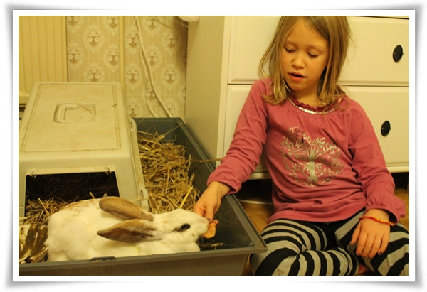 När jag redan förra veckan såg vartåt det barkade med Maggie så talade jag med barnen och Tildas första fråga var om hon skulle få en ny kanin. Jag ville att vi skulle vänta, att vi liksom skulle vara färdiga med Maggie först innan vi började tänka på sådana saker, men Tilda insisterade. ”Så att jag inte bara tänker på Maggie om hon dör, mamma”. I förrgår åkte vi till djuraffären och såg en sanslöst söt liten vilding stjäla showen i en av djuraffärens två burar. Medan barnen begeistrade betraktade den lille kaninens framfart kikade jag in i buren bredvid och såg den märkligaste lilla fluffhög jag någonsin sett. En kanin som hade spelat med i en Austinfilm i fall sådana hade kaniner i huvudrollerna. Lugn och fin, stilla funderande. Hon hade suttit i två månader i sin bur och väntat på att någon skulle välja henne. Hon hade suttit där och sett andra kaniner bli valda oräkneliga gånger och själv bara blivit kvar.