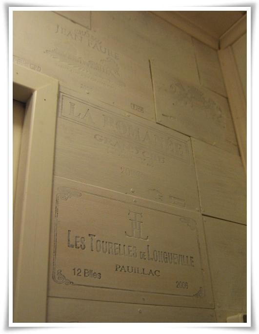 Min man, som är den i vårt förhållande med öga för design, har gjort en vägg i hallen med panel från gamla vinlådor från jobbet. Panelen vitlackerades tunt så att den skulle ge en känsla av rustik och så att texten från lådorna skulle lysa igenom. Ljust och snyggt! Och gratis…