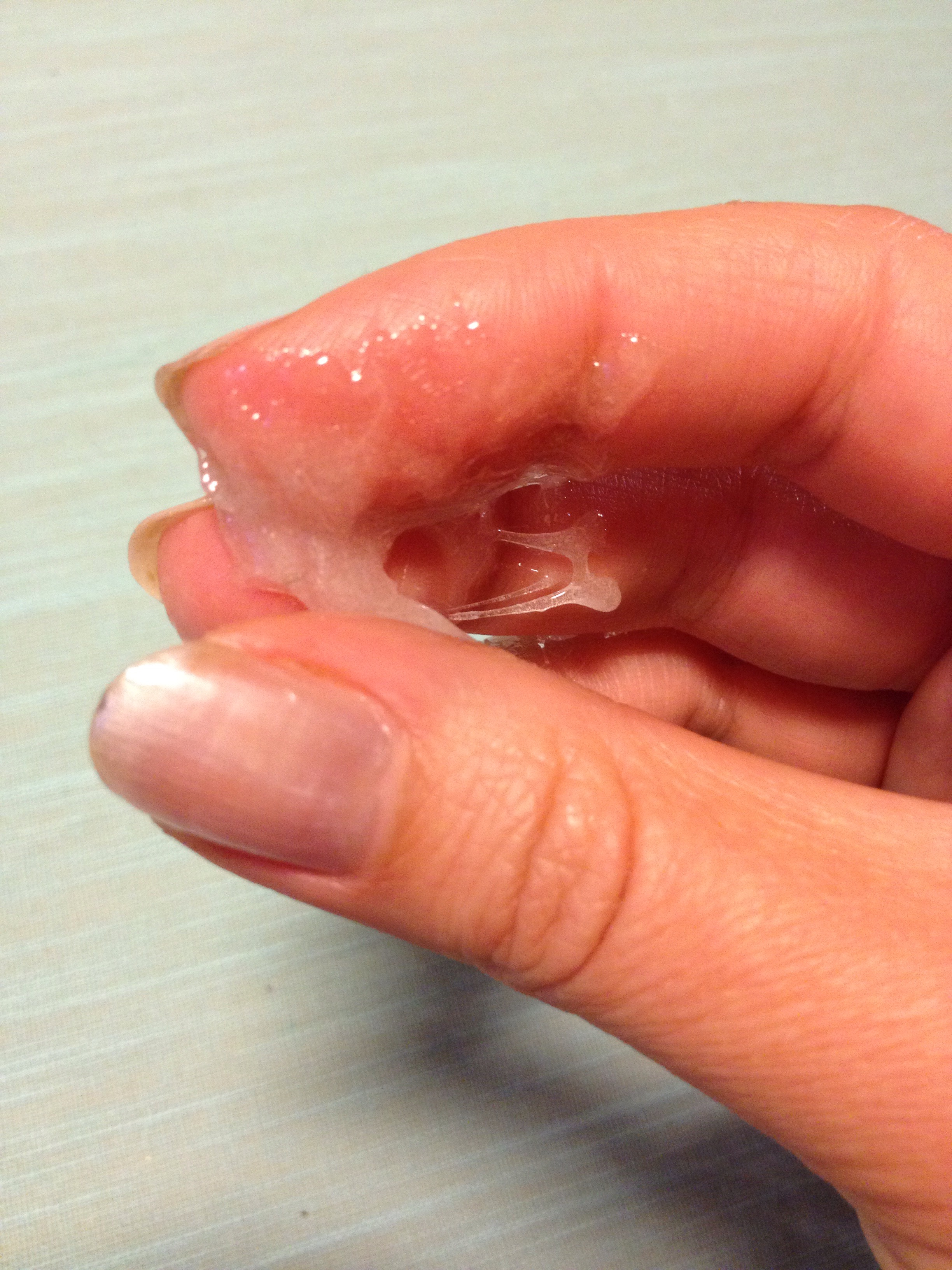 Att få sockret PÅ huden är den lätta biten. Att få sockret AV huden utan att huden följer med är det jävliga. På alla instruktionsvideor rycker de snabbt. Det fungerar så länge luftfuktigheten är typ under 30%, det är svalt och väl ventilerat i rummet och den som blir sockrad ser ut så här av den fantastiska upplevelsen.