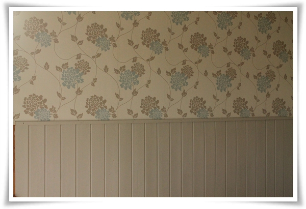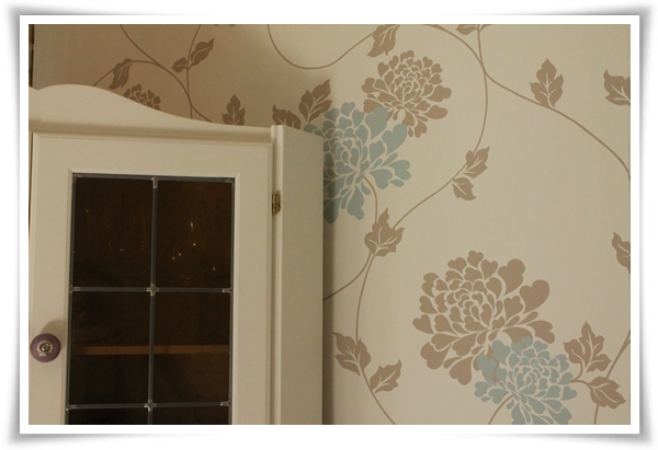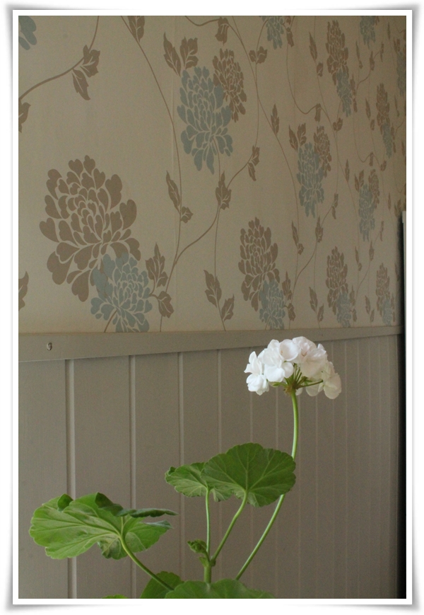 Så, här kommer äntligen de utlovade bilderna. Det vi har gjort är att vi tagit ner de gamla tapeterna (tre olika lager sådana), grundmålat de spånskivor som ligger på stockväggarna, tapetserat med en utjämningstapet och därefter med den riktiga tapeten. De grova bräder som varit golv (och som vi hittade under en linoleummatta och spånskivor) har vi bänt bort. Under fanns torrt, stort spån som vi har lämnat kvar, och istället för bräderna har vi lagt in ett nytt spontat, obehandlat trägolv. Golvet har sedan målats.