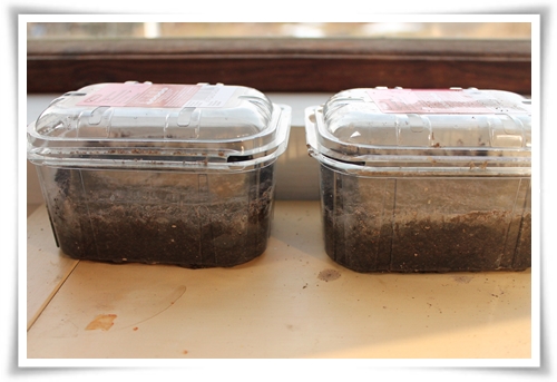 En av de bästa odlingslösningarna någonsin är att odla i gamla tomat- eller vindruvelådor. De fungerar som miniväxthus och är i regel dränerade med hål i botten. Här väntar en ny sorts akleja (som hette Petticoat Pink, klart jag var tvungen att ha den liksom) på att det ska bli varmare. Akleja behöver ofta köldbehandlas – det vill säga ligga svalt – för att gro så jag ställde ut lådorna direkt på altanen där det är några plusgrader. Vi får ser hur det går.