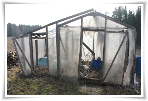 Växthuset kräver lite arbete. Vi grubblar på om vi ska ta ner det här växthuset i år och satsa på att bygga ett nytt av gamla fönster (som finns sparade) på ett bättre ställe eller om det får bli ett projekt till ett annat år.