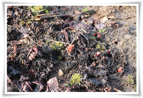 Nu när trädgården börjar smälta fram ser man tydligt de odlingsrutor som tidigare varit på baksidan. För tillfället är alla (utom ett, som vi grävde ur i höstas) fyllda med rabarber. Det är mer rabarber än vad någon behöver någonsin, och i flera av rutorna kommer rabarbern att få ge plats åt potatis, jordgubbar, jordärtskockor, rovor och sallader. Är det någon som vill ha stora, otroligt livskraftiga rabarberplantor är det bara det med sig en spade och komma! De örter jag tog med mig från förra huset ser ut att ha klarat vintern under ett täcke av löv. Oreganon tittar fram.